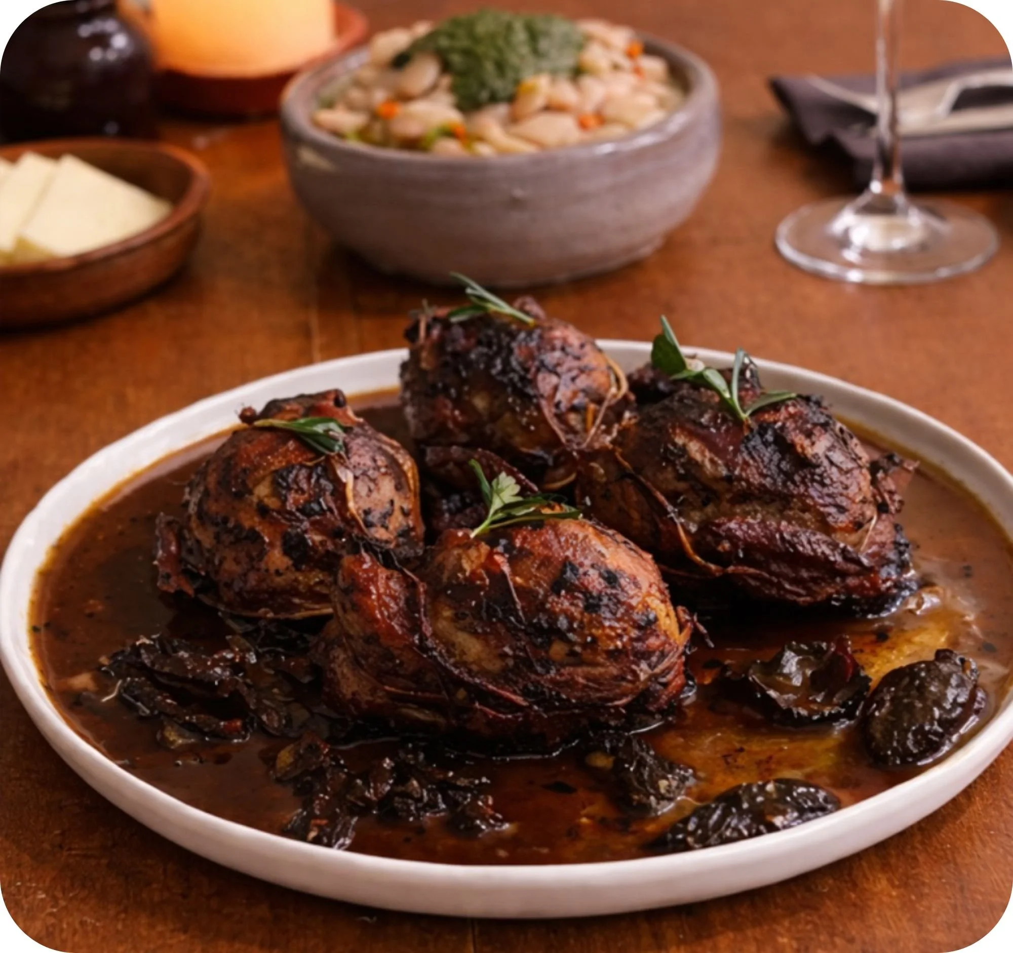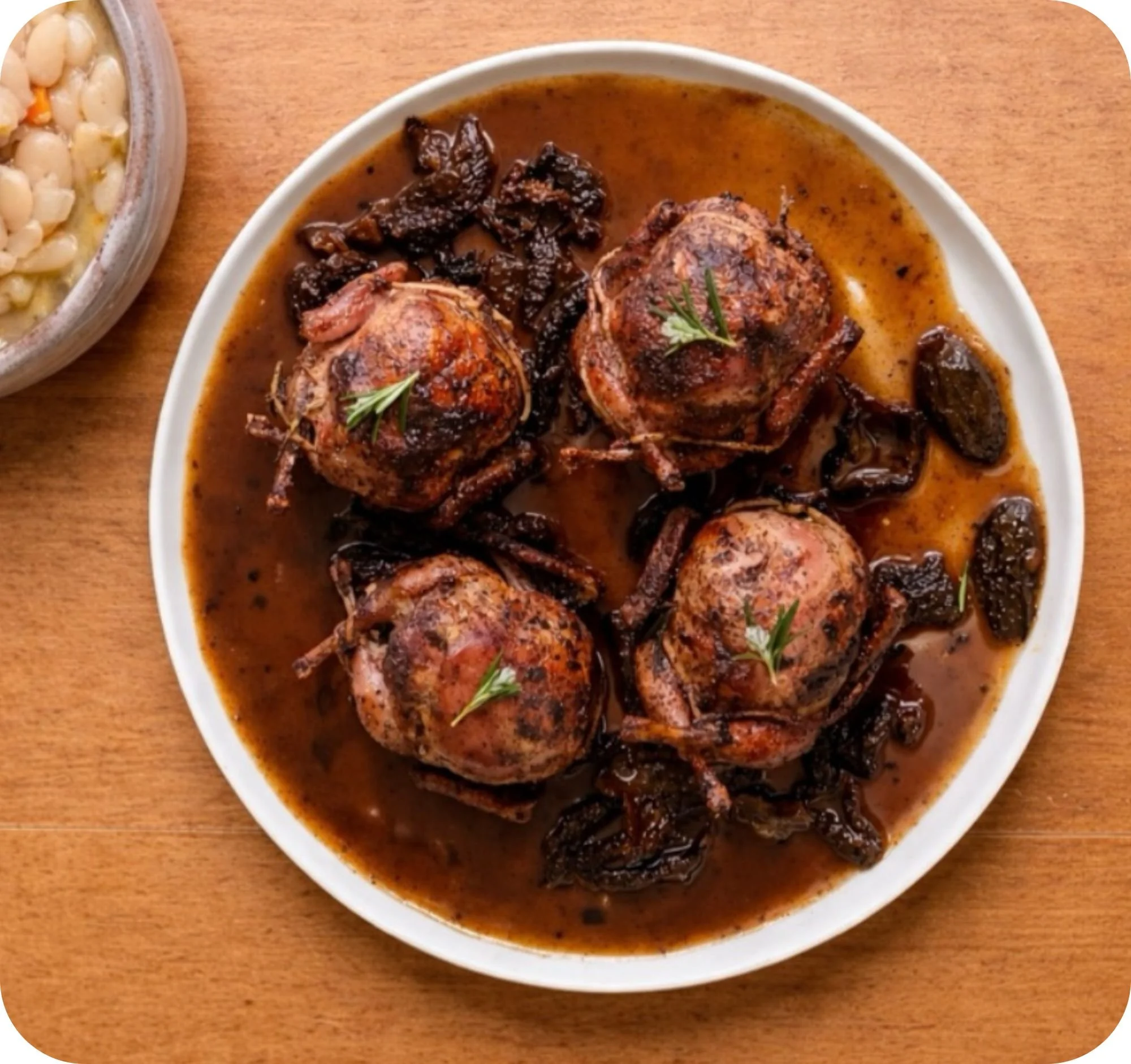 Caille Farcie aux Morilles et Châtaignes Stuffed Quail with Morels, Chestnuts & White Beans with Nettle Pistou